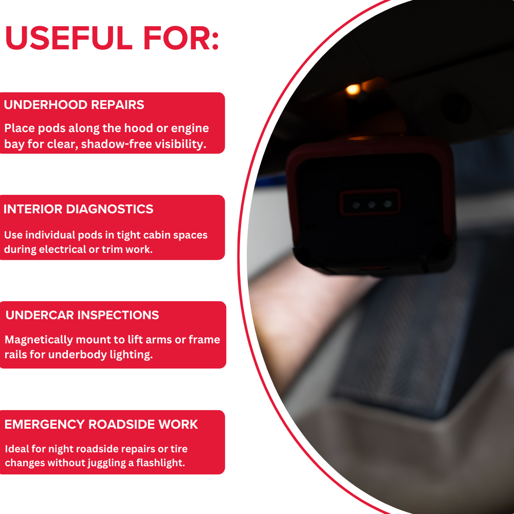 Detachable LED Pods: Use pods independently for targeted lighting—ideal for tight spaces and under-dash work.